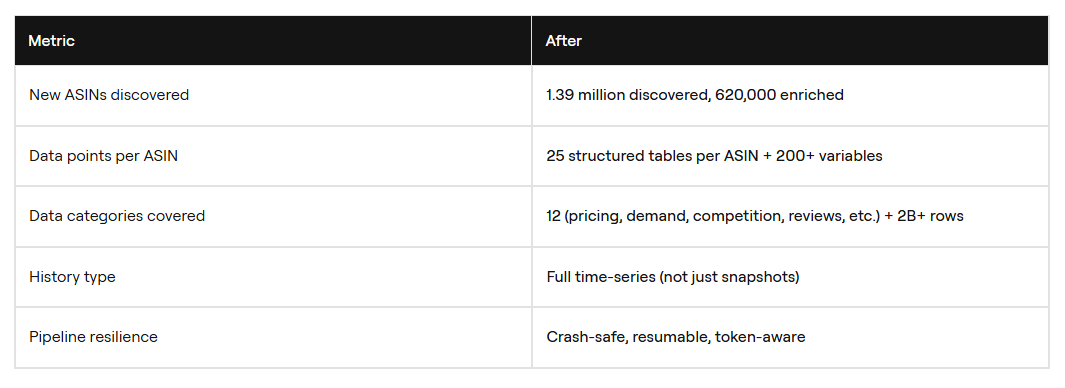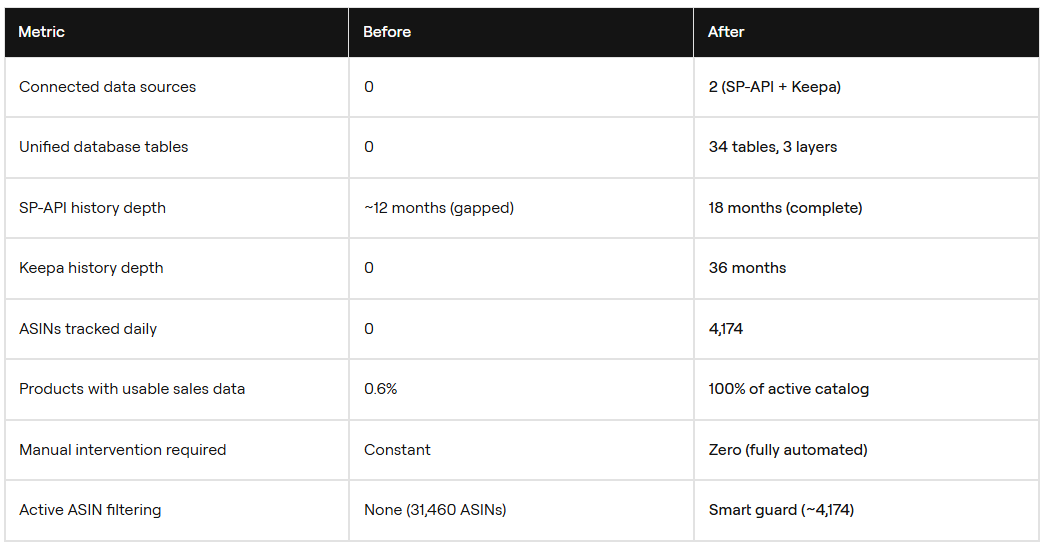 To keep data flowing reliably, we built custom retry logic with exponential backoff. We also added required cooldowns between endpoint types. We built resumable backfill loops that can survive crashes. We also built an Active ASIN Guard. It filters 31,460 ASINs down to about 4,174 active ones. This helps us spend enrichment tokens only where they matter.