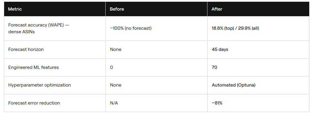 Its AUC scores range from 0.878 to 0.889. Trained on 70 engineered features drawn from 18 months of data, the ensemble achieves 18.8% WAPE on top ASINs and 29.9% overall.