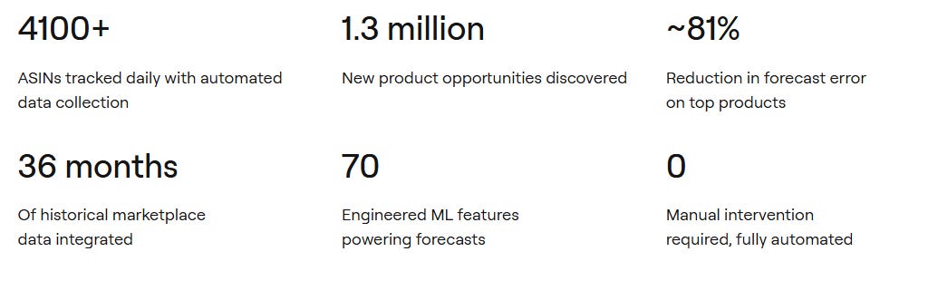 The automated PO engine uses Newsvendor optimization with a 45-day sell-through cap across five checkpoints. It includes kill switches that halt orders if margin is negative, the buy box is lost, or data is stale. Final quantities are rounded to meet MOQ rules. Budgets are allocated across the portfolio by urgency, margin, and days to stockout. Sitting alongside this is a market intelligence layer. It scores 1.39 million ASINs on demand, competition, and margin potential. It then produces a ranked list of products worth adding to the catalog.