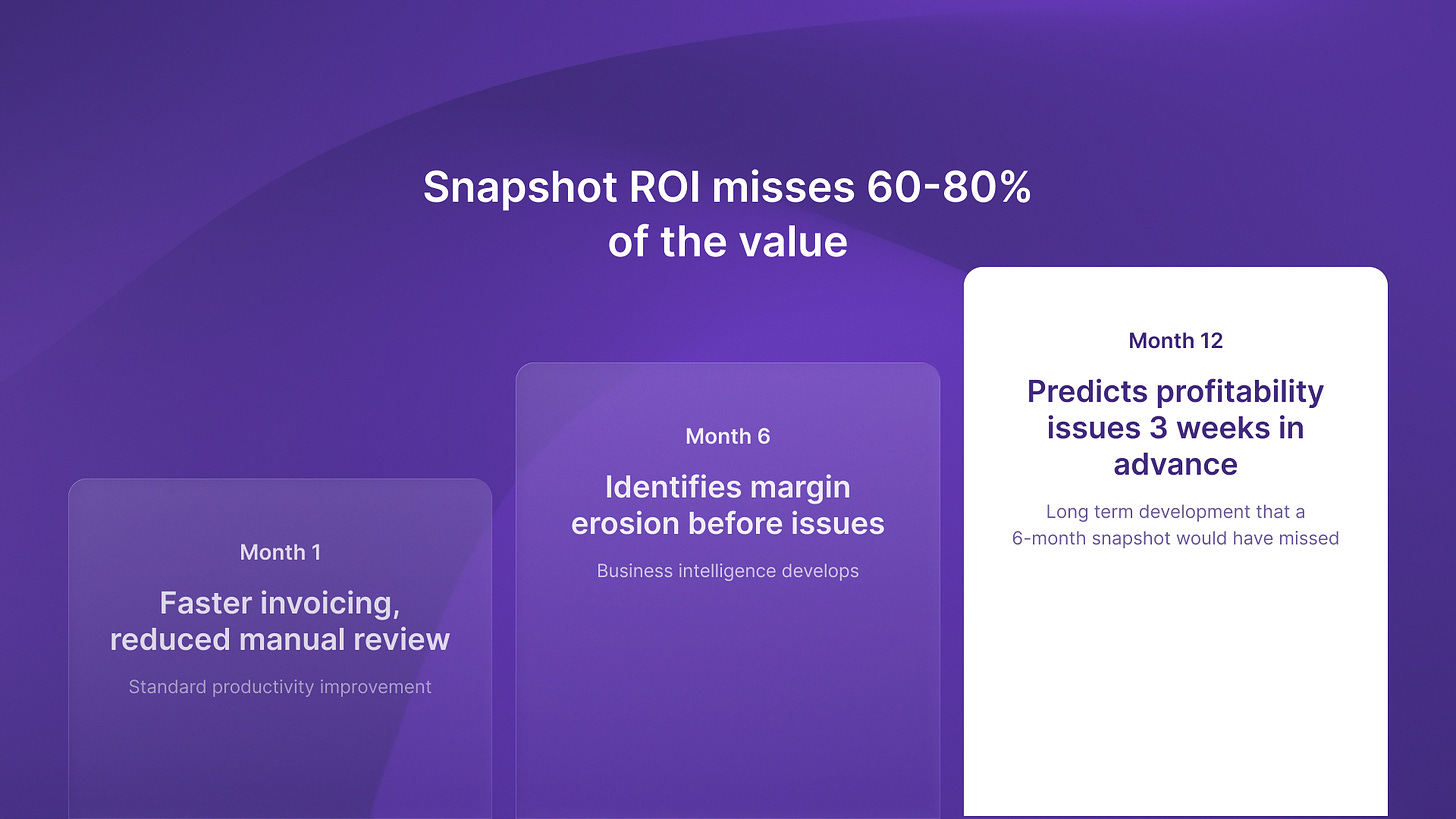 I saw this clearly at Timecapsule when we deployed autonomous project profitability monitoring. Month 1 ROI looked modest: faster invoicing, reduced manual timesheet review. Standard productivity gains.