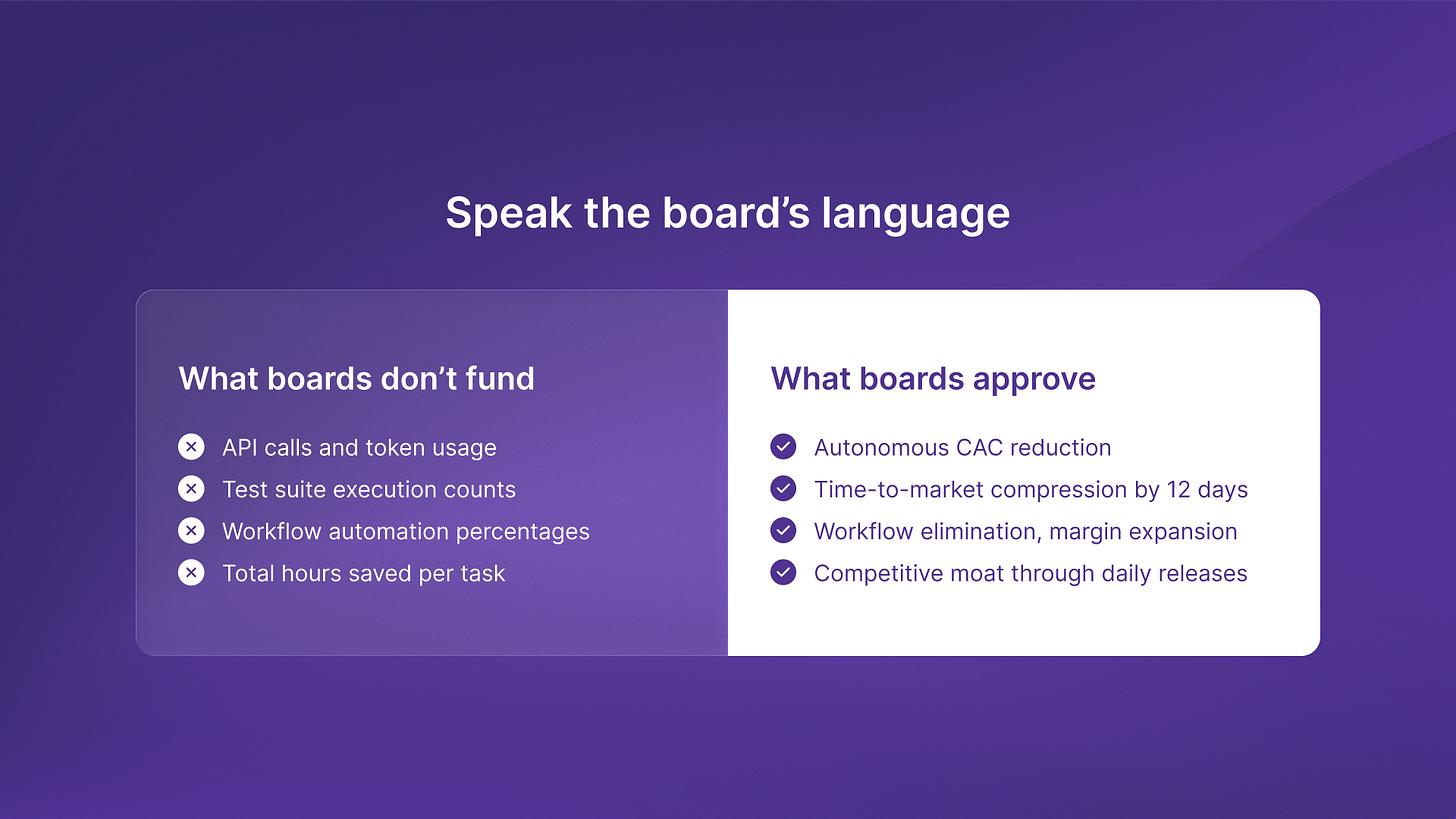 API calls, token usage, test suite execution, workflow automation percentages. All valid technical measurements. None of them link to what boards care about. Boards care about customer acquisition cost. They care about time to market. They care about higher gross margins. They care about building a competitive moat.
