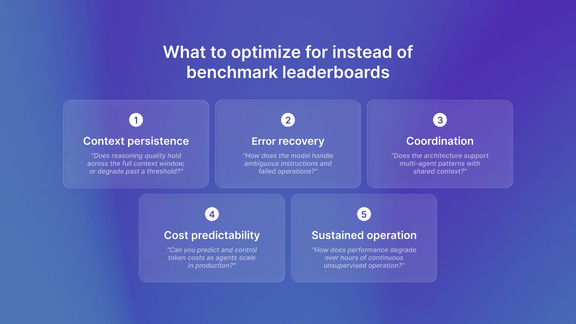 Here is what matters most for production agents. Models should keep context across sessions. They should work with other agents. They should recover from errors on their own. Benchmark scores measure none of this.